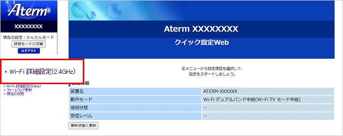 クイック設定Webのトップページから、『Wi-Fi詳細設定(2.4GHz)』(*1)を選択してください。