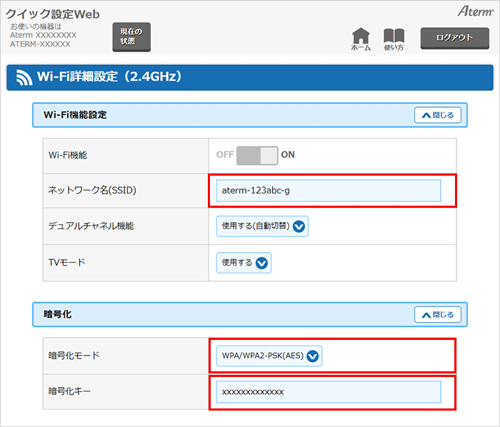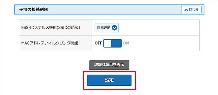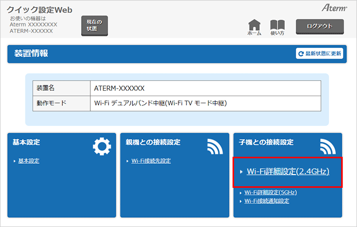 クイック設定Webのトップページから、『子機との接続設定』-『Wi-Fi詳細設定(2.4GHz)』(*1)を選択してください。