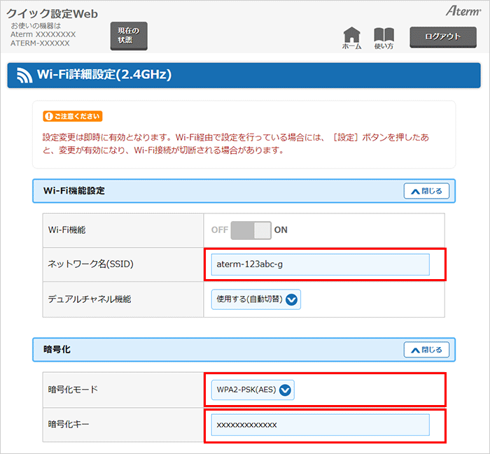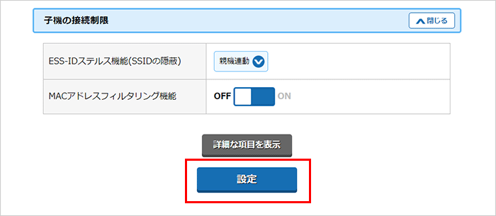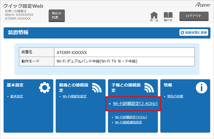 クイック設定Webのトップページから、『子機との接続設定』-『Wi-Fi詳細設定(2.4GHz)』(*1)を選択してください。