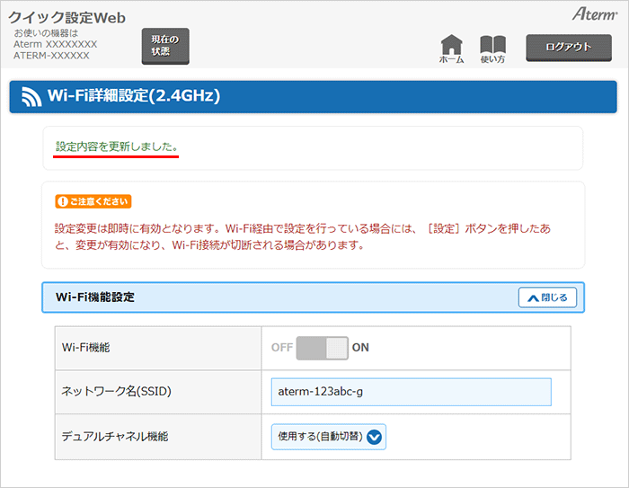 数秒ほど「設定反映中」と表示されたあとに、タイトル(『Wi-Fi詳細設定(2.4GHz)』)の下に「設定内容を更新しました。」と表示されます。