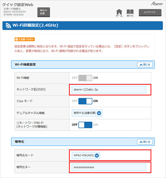 クイック設定Webのトップページから、『子機との接続設定』-『Wi-Fi詳細設定(2.4GHz)』(*1)を選択してください。