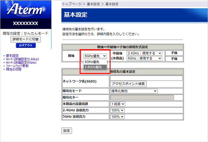 「親機⇔中継機⇔子機の接続形式設定」の[親機]で【2.4GHz優先】に変更してください。