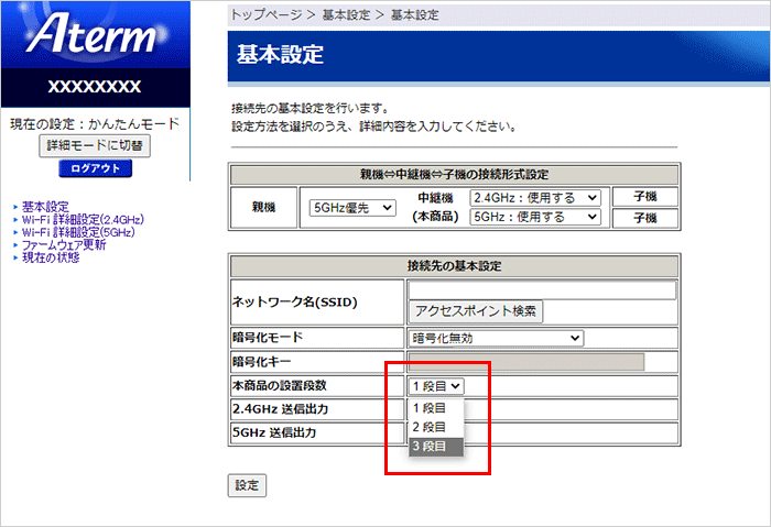 「接続先の基本設定」の[本商品の設置段数]で設定段数を【2段目】または【3段目】に変更してください。