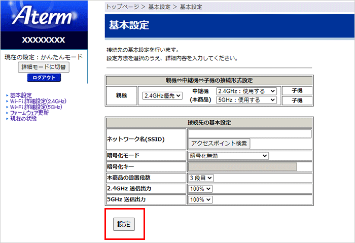 ※ 中継機〜親機間の優先接続変更のみを行いたい場合は、ここでは作業の必要はありませんので何もせず手順4にお進みください。