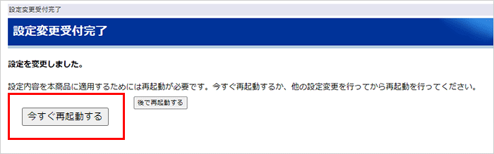 『設定変更受付完了』画面が開きますので、【今すぐ再起動する】ボタンを押して、再起動を行ってください。