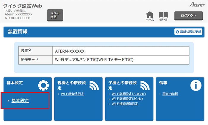 クイック設定Webのトップページから、『基本設定』-『基本設定』を選択してください。