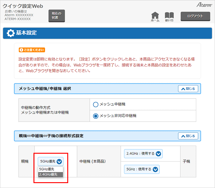 「親機⇔中継機⇔子機の接続形式設定」の[親機]で【2.4GHz優先】に変更してください。