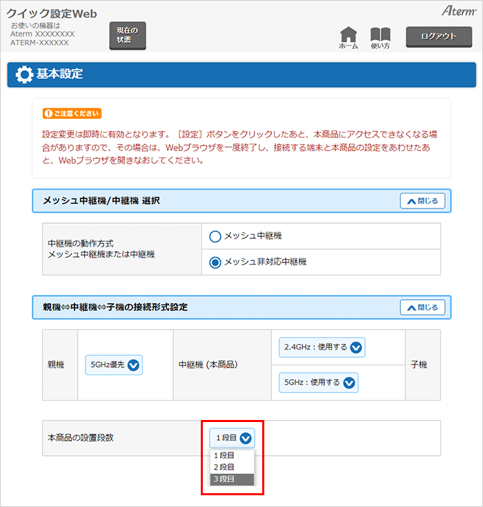 「親機⇔中継機⇔子機の接続形式設定」の[本商品の設置段数]で設定段数を【2段目】または【3段目】に変更してください。