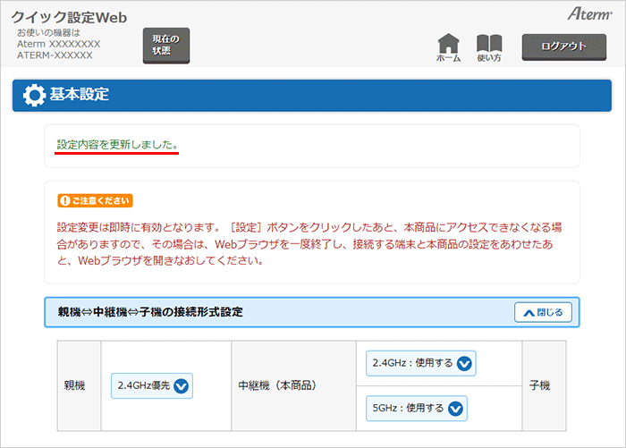 タイトル(『基本設定』)の下に、「設定内容を更新しました。」と表示されます。