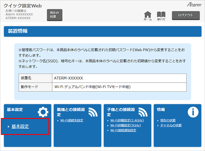 クイック設定Webのトップページから、『基本設定』-『基本設定』を選択してください。
