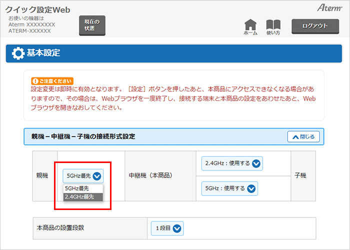 「親機−中継機−子機の接続形式設定」の[親機]で【2.4GHz優先】に変更してください。