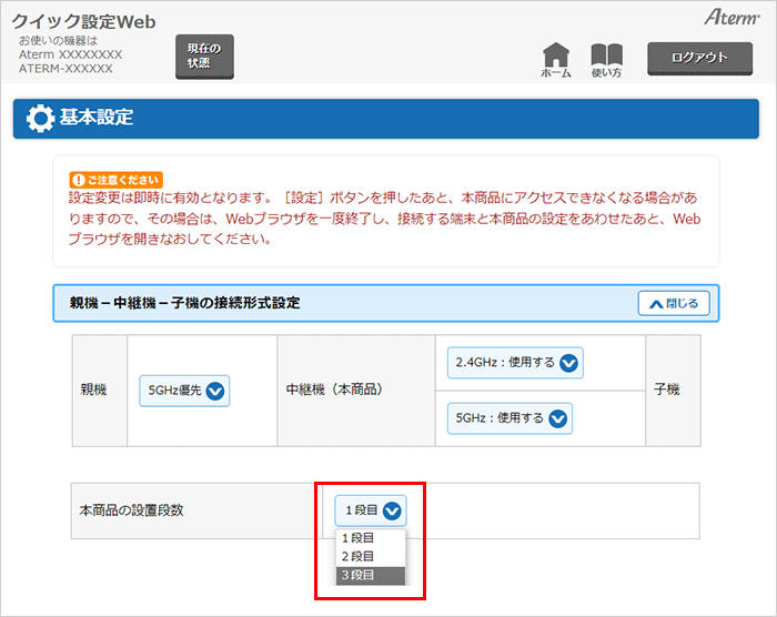 「親機−中継機−子機の接続形式設定」の[本商品の設置段数]で設定段数を【2段目】または【3段目】に変更してください。
