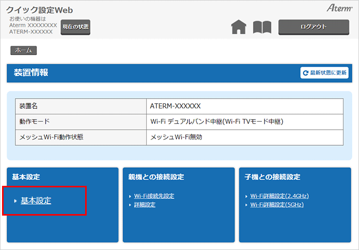 クイック設定Webのトップページから、『基本設定』-『基本設定』を選択してください。