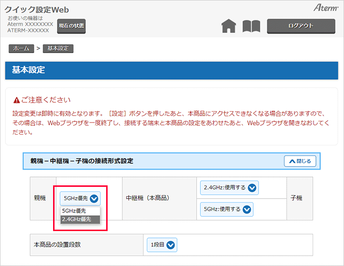「親機−中継機−子機の接続形式設定」の[親機]で【2.4GHz優先】に変更してください。
