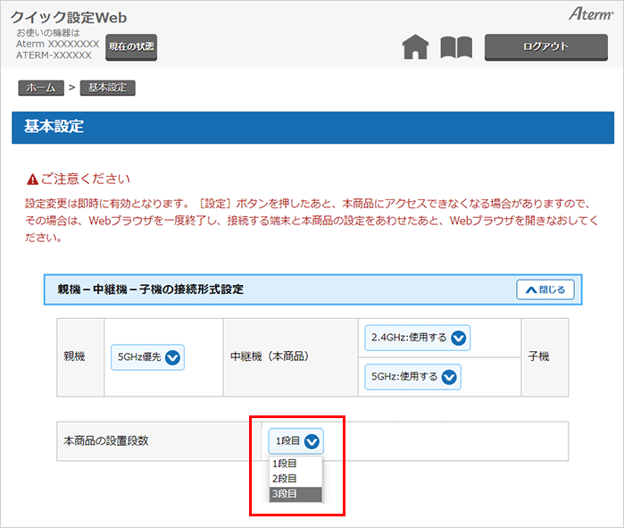 「親機−中継機−子機の接続形式設定」の[本商品の設置段数]で設定段数を【2段目】または【3段目】に変更してください。