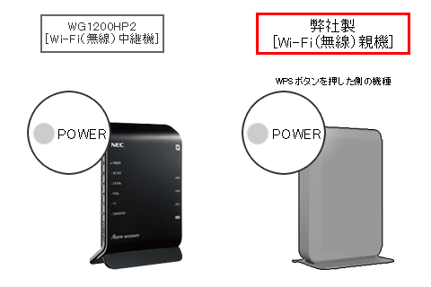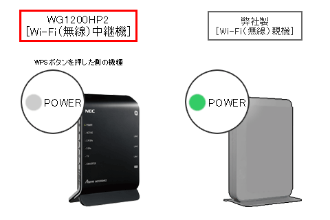 WG1200HP2のPOWERランプ点滅後、1分以内に弊社製Wi-Fi(無線)親機の「WPSボタン」を長押ししてください。