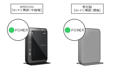 ボタンから手を放すと、WR9500Nと弊社製Wi-Fi(無線)親機のPOWERランプがオレンジ点灯から緑点灯に変わります。