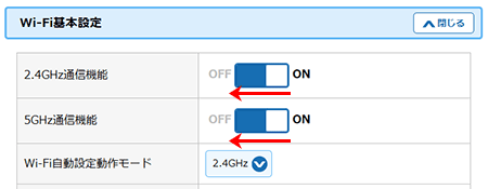 クイック設定Webを起動したいをご参照の上、クイック設定Webを開いてください。『無線LAN基本設定』画面が開きますので、「基本設定」の[2.4GHz通信機能][5GHz通信機能]で【使用する】に入っているチェックを外し、【設定】ボタンを押してください。