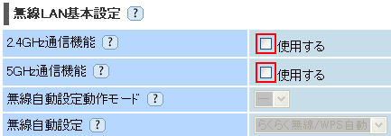 クイック設定Webを起動したいをご参照の上、クイック設定Webを開いてください。『無線LAN基本設定』画面が開きますので、「無線LAN基本設定」の[2.4GHz通信機能][5GHz通信機能]で【使用する】に入っているチェックを外し、【設定】ボタンを押してください。