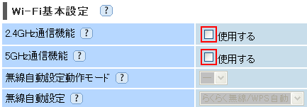 クイック設定Webを起動したいをご参照の上、クイック設定Webを開いてください。『Wi-Fi基本設定』画面が開きますので、「Wi-Fi基本設定」の[2.4GHz通信機能][5GHz通信機能]で【使用する】に入っているチェックを外し、【設定】ボタンを押してください。