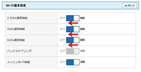クイック設定Webを起動したいをご参照の上、クイック設定Webを開いてください。『Wi-Fi基本設定』画面が開きますので、「Wi-Fi基本設定」の[2.4GHz通信機能][5GHz通信機能][6GHz通信機能]を【OFF】にして【設定】ボタンを押してください。