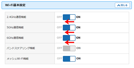 クイック設定Webを起動したいをご参照の上、クイック設定Webを開いてください。『Wi-Fi基本設定』画面が開きますので、「Wi-Fi基本設定」の[2.4GHz通信機能][5GHz通信機能][6GHz通信機能]を【OFF】にして【設定】ボタンを押してください。