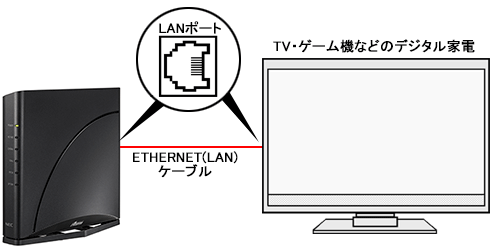7200D8BEのLANポートと装置(テレビ・プリンタ・ゲーム機などのネットワーク家電)のLANポートを、ETHERNET(LAN)ケーブルで接続してください。