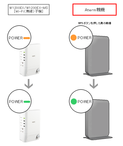W1200EX / W1200EX-MSのPOWERランプ点滅後、1分以内にAterm親機の「WPSボタン」を長押ししてください。