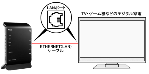 WG1200HP3のLANポートと装置(テレビ・プリンタ・ゲーム機などのネットワーク家電)のLANポートを、ETHERNET(LAN)ケーブルで接続してください。