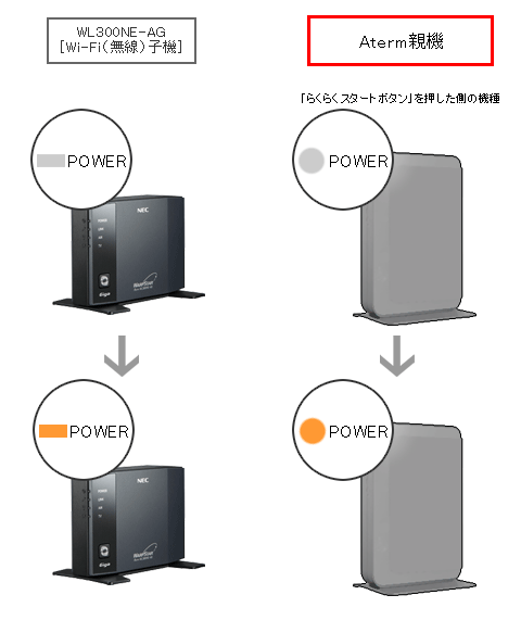 WL300NE-AGのPOWERランプ点滅後、1分以内にAterm親機の「らくらくスタートボタン」を長押ししてください。