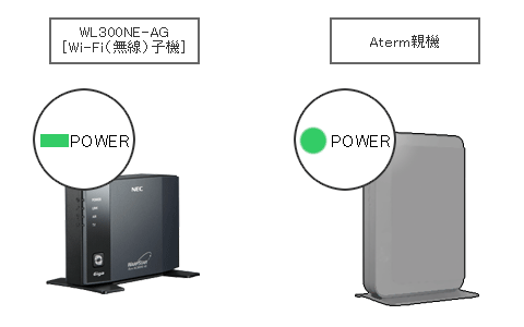 ボタンから手を放すと、WL300NE-AGとAterm親機のPOWERランプがオレンジ点灯から緑点灯に変わります。