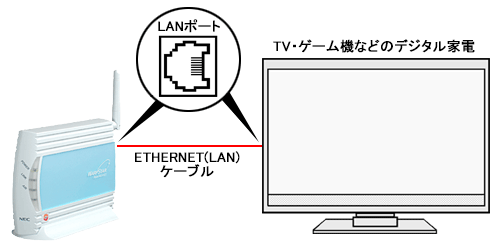 電源を切った状態で、WL54SE2のLANポートと装置(テレビ・プリンタ・ゲーム機などのネットワーク家電)のLANポートを、ETHERNET(LAN)ケーブルで接続してください。