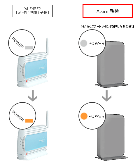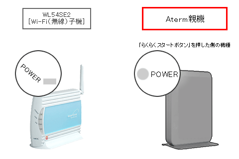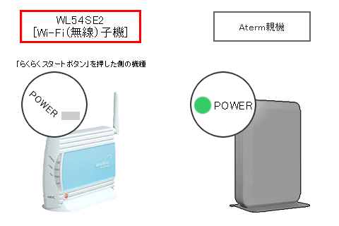 WL54SE2のPOWERランプ点滅後、1分以内にAterm親機の「らくらくスタートボタン」を長押ししてください。