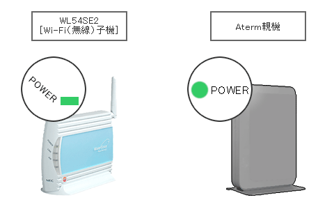 ボタンから手を放すと、WL54SE2とAterm親機のPOWERランプがオレンジ点灯から緑点灯に変わります。