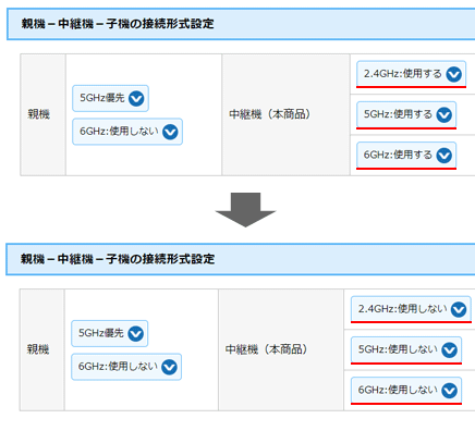 中継機の機能を停止して、子機のみで使用したい場合は、クイック設定Webの『基本設定』で「親機−中継機−子機の接続形式設定」の「中継機(本商品)」を「2.4GHz:使用しない」「5GHz:使用しない」「6GHz:使用しない」に変更して、設定を保存してください。