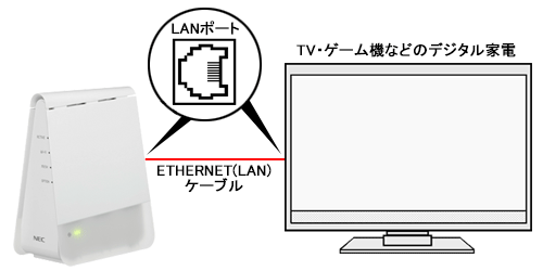 WX1800HPのLANポートと装置(テレビ・プリンタ・ゲーム機などのネットワーク家電)のLANポートを、ETHERNET(LAN)ケーブルで接続してください。
