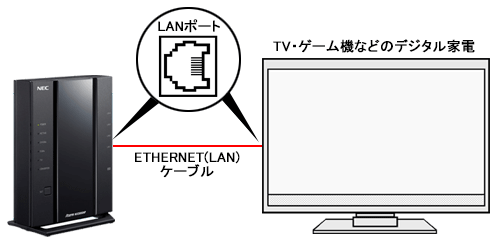 WX3000HPのLANポートと装置(テレビ・プリンタ・ゲーム機などのネットワーク家電)のLANポートを、ETHERNET(LAN)ケーブルで接続してください。