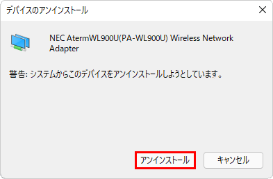 「警告:システムからこのデバイスをアンインストールしようとしています」と表示されましたら、「アンインストール」ボタンを押します。