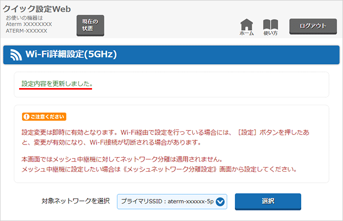 クイック設定Webのホーム画面で、『Wi-Fi詳細設定(5GHz)』を選択してください。