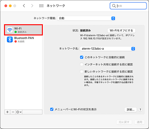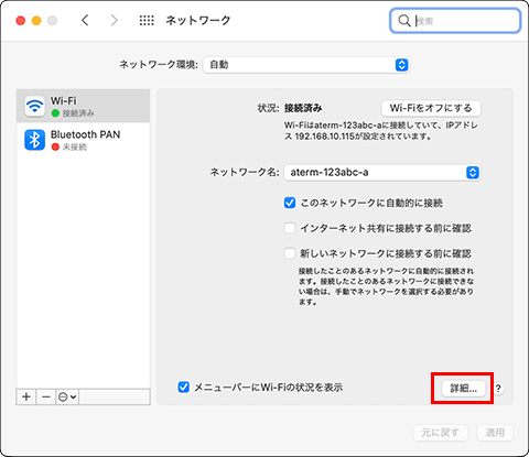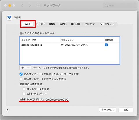 『Wi-Fi MACアドレス』(OSによっては『Wi-Fiアドレス』または『AirMac ID』)より、MACアドレスの確認が行えます。