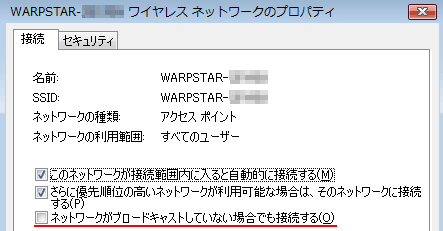 「ネットワークがブロードキャストしていない場合でも接続する」にチェックが入っていない場合は、チェックを入れて「OK」ボタンを押して画面を閉じます。