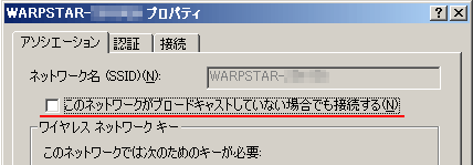 「このネットワークがブロードキャストしていない場合でも接続する」にチェックが入っていない場合は、チェックを入れて「OK」ボタンを押して画面を閉じます。