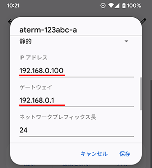 IPv4アドレスに『192.168.0.100』 / ルーターに『192.168.0.1』