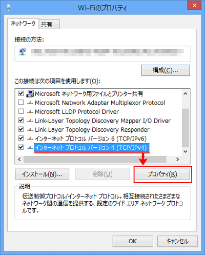 「インターネット プロトコル バージョン4(TCP/IPv4)」を選択して、【プロパティ】を押してください。