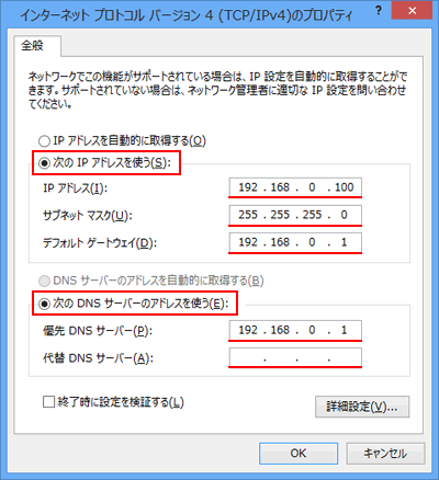 [次のIPアドレスを使う]、[次のDNSサーバーのアドレスを使う]を選択して、固定するIPアドレスを入力してください。