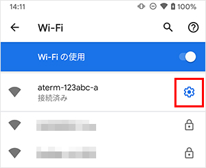 接続中のネットワーク名(SSID)の右側にある「歯車」の形をしたアイコンをタップしてください。
