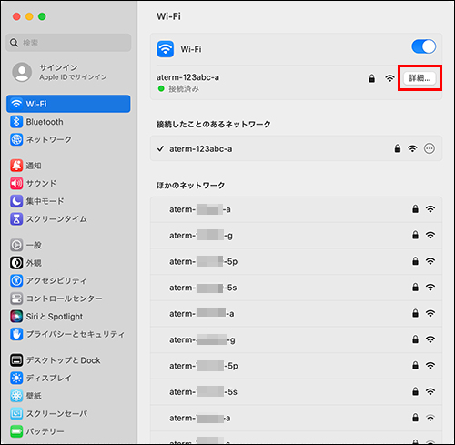 接続済みのネットワーク名(SSID)の【詳細...】を押してください。