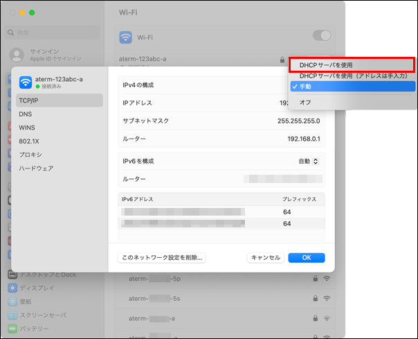 「IPv4の構成」で[DHCPサーバを使用]を選択してください。
