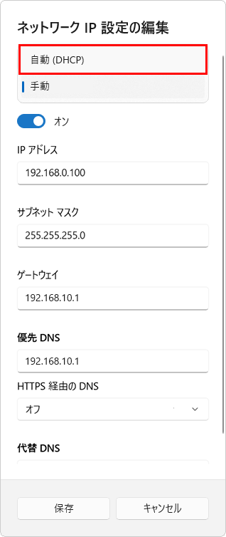 ネットワーク IP 設定の編集が開くので、「自動(DHCP)」を選択してください。