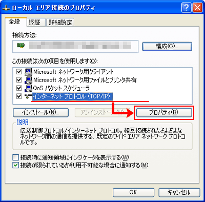 「インターネット プロトコル (TCP)」を選択して、【プロパティ】を押してください。